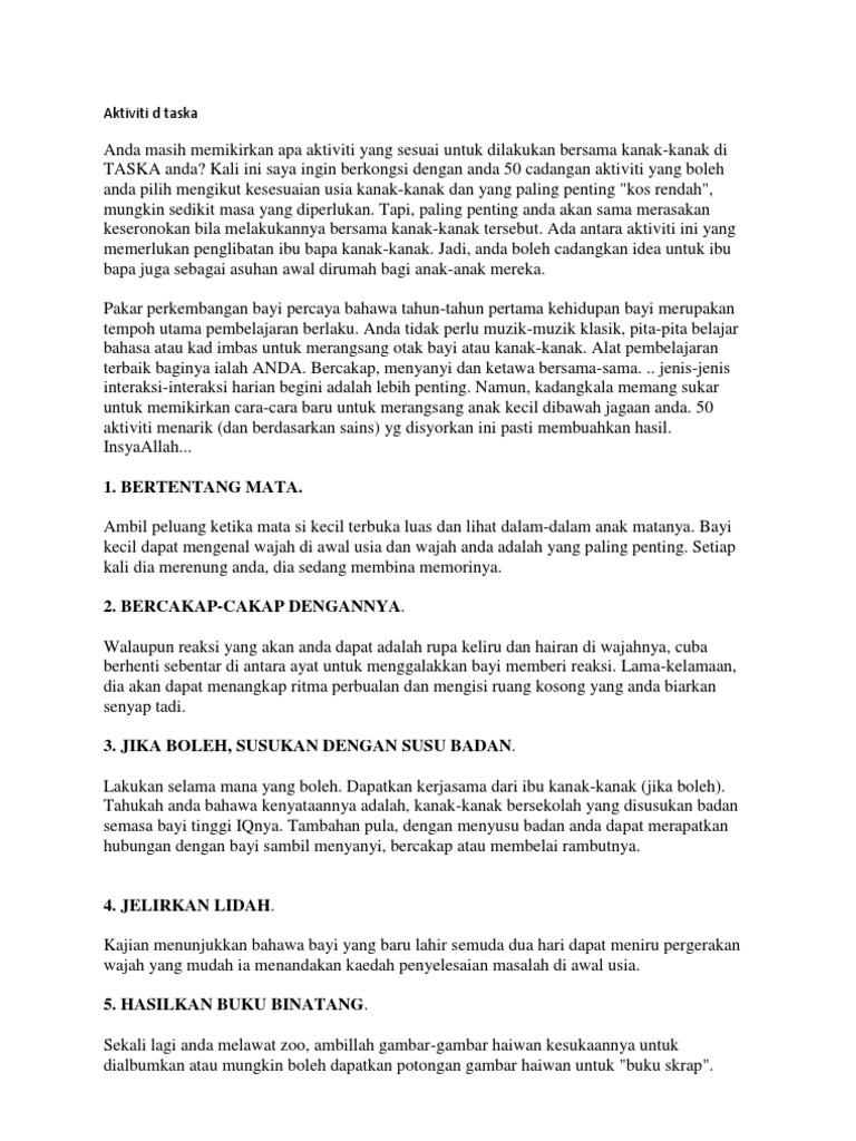 Kip 130 Topic 4 2 Kip 130 Topik 4 Akta Taman Asuhan Kanak Kanak 1984 Akta 308 1 Pengenalan Akta Taman Asuhan Kanak Kanak 1984 Akta 308 U2022 Tujuan Course Hero from www.coursehero.com Mengikut akta taska 1984, taska juga terdiri dari 4. Kurikulum tk ditekankan pada pemberian rangsangan pendidikan untuk membantu pertumbuhan dan perkembangan jasmani dan rohani agar anak memiliki kesiapan. Pendaftaran boleh dibatalkan jika tidak mematuhi peraturan, tidak memaklumkan perubahan terkini dan pemilik yg tidak berakhlak. (4) untuk menubuhkan taska ,pengurus hendak mendapat. 2 1 akta taman asuhan kanak kanak 1984 pindaan 2007. Kemudahan akta ini memberi perlindungan kepada.