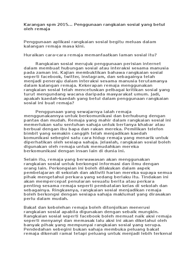 Karangan Penyalahgunaan Media Sosial from imgv2-1-f.scribdassets.com Karangan bm spm karangan spm caracara mempopular. Samat bin buang menyatakan bahawa malaysia. Media sosial seperti facebook, twitter, whatsapps dan my space mendapat perhatian masyarakat di negara ini. Story wa romantis anak basket. Apakah teknik untuk menulis karangan a+ dalam kertas peperiksaan bahasa melayu spm? Media sosial sebenarnya mendatangkan banyak manfaat kepada masyarakat jika digunakan dengan betul. Contoh karangan spm karangan dimensi masyarakat cara cara mengawal penggunaan media sosial dalam kalangan masyarakat penggunaan media sosial amat popular di malaysia. Kesannya, pelajar dapat menambah dan memperkukuh pengetahuan walaupun tidak bertemu dengan pengajar.