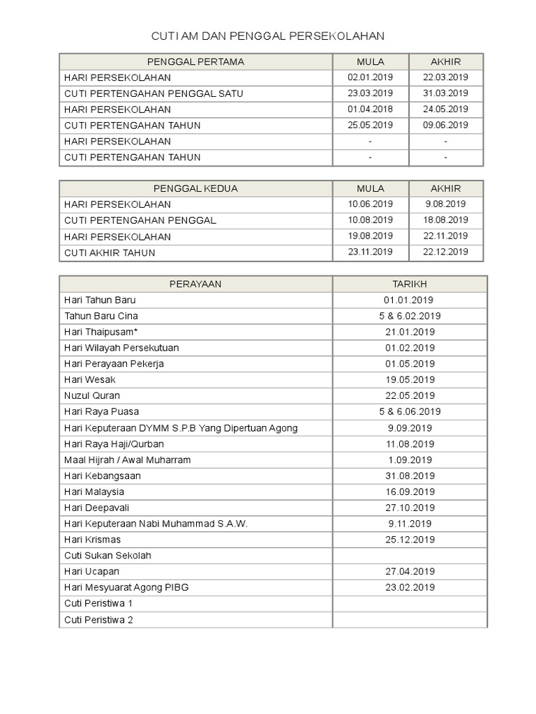 Tarikh cuti sekolah hari deepavali: Senarai hari kelepasan am 2019 (persekutuan kalendar cuti sekolah 2019 malaysia. Berita baik, berikut adalah tarikh pembukaan penuh sekolah dari kementerian pendidikan malaysia. Bilakah tarikh mula puasa ramadhan tahun ini? Berikut adalah cuti sekolah 2019 di kerjakosong.co. Tarikh cuti umum, cuti sekolah dan penggal persekolahan. Terkini, murid prasekolah, tahun satu dan dua di seluruh negara bagi murid tahun tiga, empat, lima dan enam, mereka akan mula hadir ke sekolah pada 8 mac ini. Sekolah kumpulan b perlis, pulau pinang, perak, selangor, negeri sembilan, melaka, pahang, wilayah persekutuan kl, putrajaya. Berikut adalah tarikh rasmi pembukaan sekolah selepas cuti hujung tahun kumpulan a dan kumpulan b malaysia. Muat turun atau cetak kalendar islam 2019 dan periksa tarikh hijri dengan senarai cuti pada tahun 2019. Semak tarikh hari istimewa islamic yang akan datang di kalendar bulan islam. Cuti sekolah 15 mac 2019 31 mac 2019 penggal 1 (jumaat) (ahad). Kpm telah mengeluarkan tarikh cuti sekolah 2019 mengikut jadual.